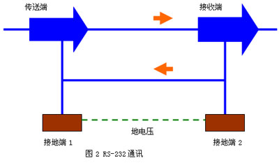 (1)RS-232通訊。RS-232的信號準位乃是參考地線而來的,如圖2所示,傳輸端參考接地端1來傳送數據;接收端則參考接地端2還原出傳送端的信號準備。