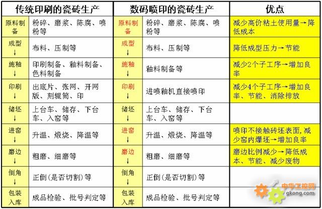 瓷磚的主要生產過程為:備料-壓制成型-干燥-施釉及印花-燒成—拋光/打蠟。其中施釉及印花過程(即印刷過程)是窯前彩圖瓷磚生產的關鍵,其工藝方式和過程較大程度地決定了原材料消耗率、正品率、產品檔次、生產成本、能耗、污染、排放等因素。作為陶瓷生產工藝核心的印刷技術已經歷