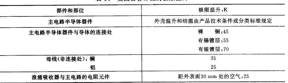 在GB/T3859.1-1993的“檢驗與實驗”中6.4.6“溫升試驗”中給出了具體要求:溫升試驗的目的在于測定變流器在額定條件下運行時各部件的溫升是否超過規定的極限溫升。半導體器件的溫升極限可以是規定點(例如外殼)的最高溫升,也可以是等效結溫,由制造廠決定。變流器各部位的極限溫升如下表: