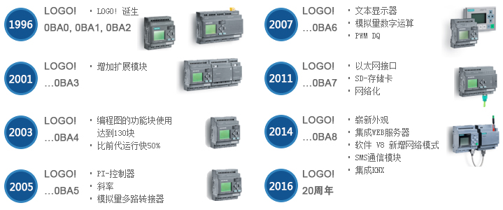 LOGO! 最早是為了填補繼電器與PLC之間市場空白,自1996年誕生至今,20年間經歷了8代產品,它由一個最簡單的邏輯控制器,逐步拓展到可擴展、可接HMI、可插SD卡、以太網甚至WEB Server等功能,讓用戶工程師的靈感得以盡情釋放。