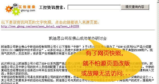 真正的全文檢索; 分類明晰,定位準確, 產品、論壇、商機、企業、應用與文摘、資訊、下載、招聘分別搜; 專注,只搜工控自動化行業; 采用專用搜索引擎技術,搜索速度快; 帶網頁快照