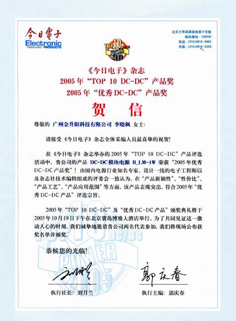 《今日電子》雜志社舉行的“2005年TOP10 DC-DC獎”、“2005年優(yōu)秀DC-DC產(chǎn)品獎”評選活動,MORNSUN公司產(chǎn)品名列其中,這些評選活動結(jié)果由讀者自由投票以及權(quán)威專家評比產(chǎn)生,所得評比結(jié)果公平、公正。其中獲獎產(chǎn)品之一的, MORNSUN公司現(xiàn)熱銷產(chǎn)品B_LM-1W電源模塊,在國內(nèi)外的銷量一直穩(wěn)居榜首的,深受廣大客戶的好評,這次評選活動又一次有力地證實了MORNSUN公司產(chǎn)品無論從研發(fā)技術(shù)、產(chǎn)品可靠性、產(chǎn)品性能來說在行業(yè)中都首屈一指,值得信賴。