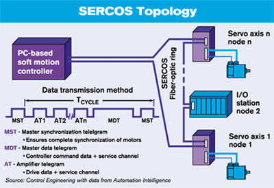 基于SERCOS的系統可用于高性能的應用中,可以連接多達32個伺服驅動器和一個運動控制器。 (SERCOS規范支持254個驅動器和I/O站點)。SERCOS通信協議支持由運動控制器傳送驅動參數,對伺服驅動器可以實現自動建立連接、精確控制和智能診斷功能。由于SERCOS協議特點決定了其對網絡通信帶寬的需求相對較低,因此可保證所有連接在SERCOS網絡上的運動控制器和伺服驅動器其通信周期小于1毫秒。采用SERCOS的用戶會發現,,相比于傳統的模擬技術,SERCOS使他們的機械運行快速,而且精確度更高。