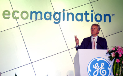 “綠色創(chuàng)想”是GE公司的一項(xiàng)全球戰(zhàn)略舉措。GE將大幅度增加對(duì)環(huán)保技術(shù)的研發(fā)投資,幫助全球客戶解決日益嚴(yán)峻的環(huán)境挑戰(zhàn),同時(shí)減少自身在全球生產(chǎn)和經(jīng)營活動(dòng)中的溫室氣體排放,并以環(huán)保產(chǎn)品和服務(wù)作為新的業(yè)務(wù)增長點(diǎn)。