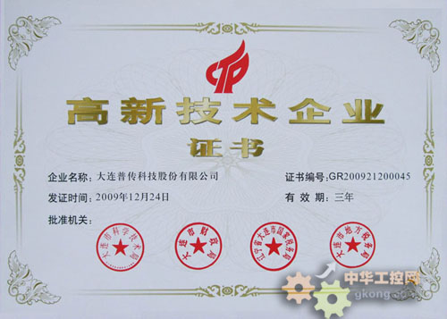日前,大連普傳科技股份有限公司經(jīng)審定,被認(rèn)定為“國家級高新技術(shù)企業(yè)”(證書編號:GR200921200045,有效期三年),這標(biāo)志著普傳科技發(fā)展的又一個新的里程碑。