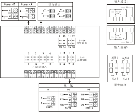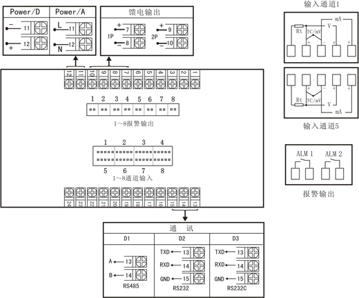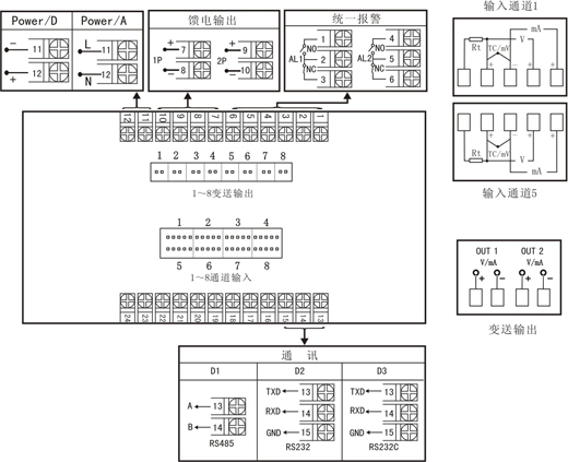 注1:接線圖中在同一組端子標有不同功能的,只能選擇其中一種功能,如RS485和RS232在同一組接線端子上,只能選擇一種。 注2:C型統一變送輸出接線端子在1號輸出端子上。 | |