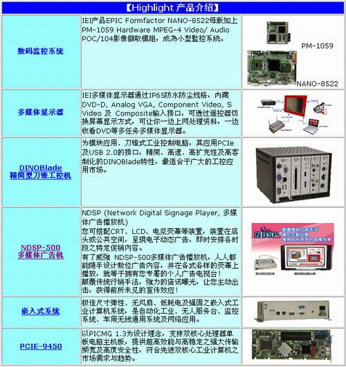 此次威強在2006中國(北京)國際網絡安全技術與應用展覽會里將展出展示安防監控系統外同時展示符合歐盟RoHS指令之最新單板計算機及嵌入式主板、電源模塊、以及通過IP65認證的工作站電腦、平板電腦、醫療應用平板電腦、在系統方面同時也展出嵌入式系統、特別是今年度才推出最先進的多媒體廣告播放機NDSP-500,多媒體顯示器等,來到威強的攤位走一遭您將有機會第一時間接觸威強最新工業等級解決方案,并與威強產品專家交換心得,讓威強不斷的創新的產品與貼心OEM/ODM的服務內容,引領您進入工業電腦包羅萬象的應用范例。