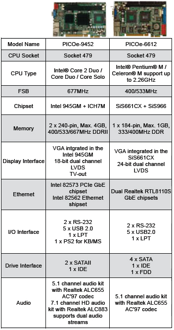 PICOe-9452采用ntel® Socket479 Core 2 Duo, Core Duo/Solo CPU插槽,采用Intel® 945GM + ICH7M芯片組,F(xiàn)SB最高可達(dá)667MHz ,2根DDRII內(nèi)存插槽最大可支持到4GB。PICOe-9452還支持雙千兆以太網(wǎng)、5個(gè)USB2.0、2個(gè)SATAII接口、LVDS接口。配合最新的PICOe底板,PICOe-6612LVDS可擴(kuò)充4個(gè)32位標(biāo)準(zhǔn)PCI插槽和多個(gè)PCI-E x4、PCI-E x1插槽。