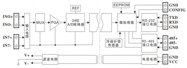 ● 內(nèi)部一路DS18B20溫度傳感器用于熱電偶冷端補(bǔ)償