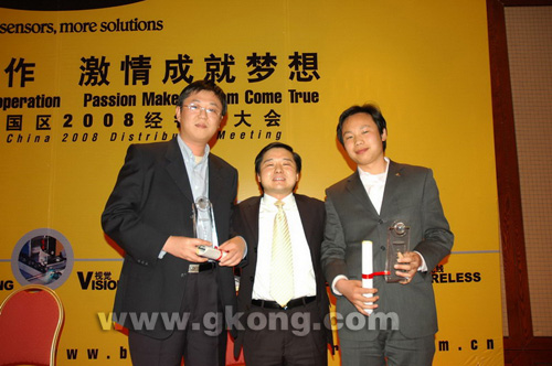 最后美國邦納總部副總裁BobSchlicksup先生與大中華區董事總經理胡勇先生向2007年取的優秀業績的經銷商頒獎,現場氣氛達到高潮。與會者堅信通過邦納公司和各經銷商們的強強聯合美國邦納在2008年將會以更先進、更優異、更嶄新的姿態翱翔在中國自動化產業傳感器領域的天空。