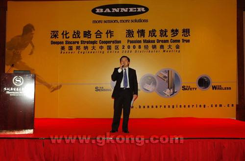 大會在上午9點開始,美國邦納大中華區董事總經理胡勇先生回顧了邦納公司在過去一年里取得的輝煌成果和進步,展望2008年將是深化戰略合作,成就夢想的年度。胡總經理堅信只有邦納公司和中國區的經銷商們的互動溝通、精誠合作,才能在新的2008年中取得更輝煌的增長。廣大經銷商根據各自自身不同的特點各抒己見,提出的具有針對性的見解及建議,現場氣氛團結熱烈,令人振奮。胡總經理在開幕詞的最后總結了中國的自動化市場的過去和將來,指出2008年不僅對邦納將是一個機遇,對經銷商也一次重要的機遇,2008年將是美國邦納和經銷商們戰略合作,成就夢想,共創輝煌的年度。