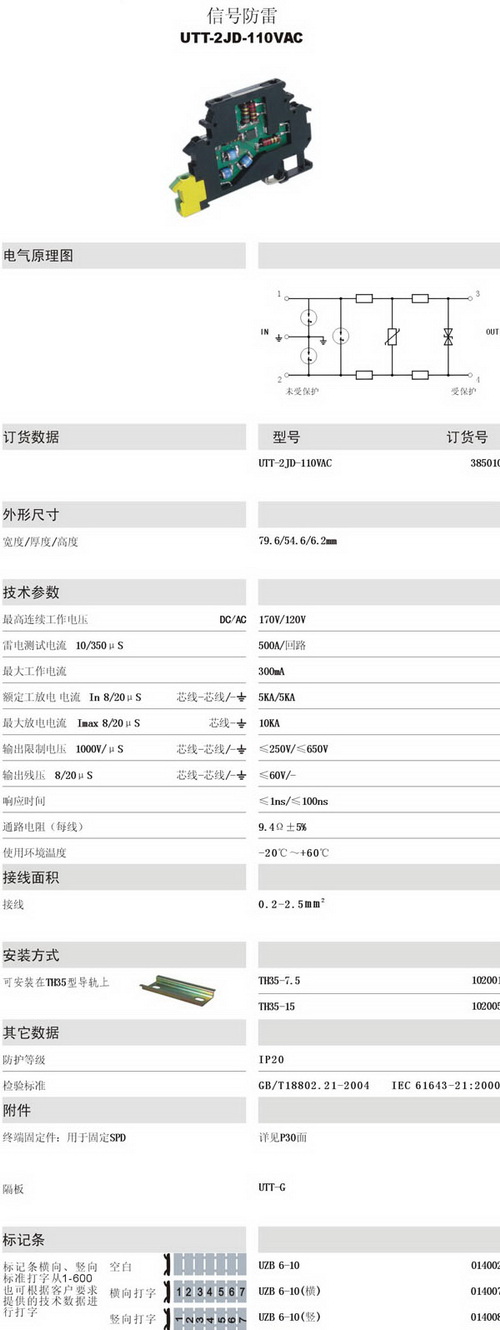 UTT-2JD-110VAC 信號防雷電涌保護器