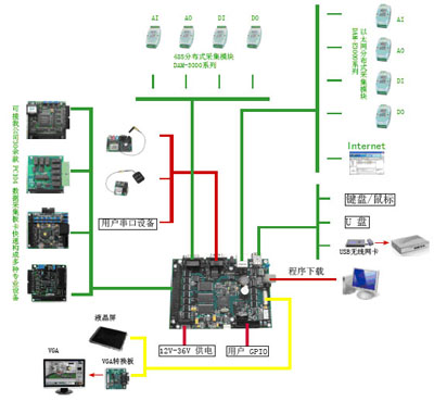 嵌入式工控主板通過板載串口、網口等功能,可以迅速構建現場總線控制系統。具有10/100M以太網接口,使系統能夠方便的接入企業信息管理層,實時地實現本地監控或者遠程監控;也可以利用以太網傳輸速率高的特點,作為終端管理單元,連接以太網(DAME3000)采集模塊和RS485/232(DAM-3000)采集模塊;多串口聯網設備;外掛PC104數據采集板卡,實現對現場設備的信號快速采集和實時控制。其參考應用圖如下: