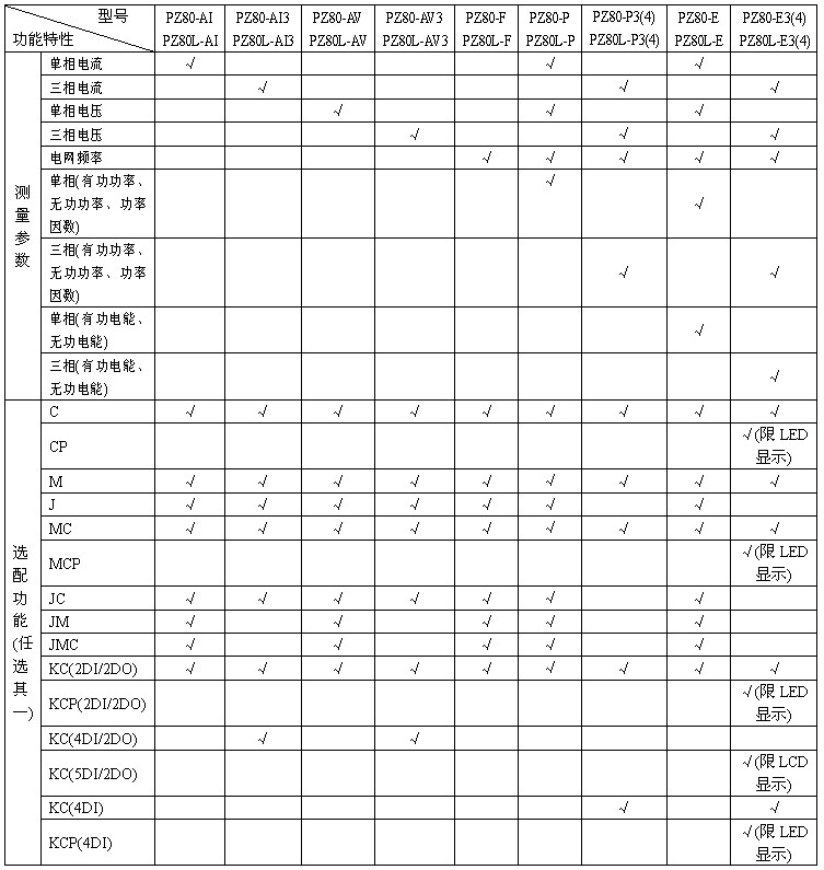 3、PZ80(L)-E3(4)在選配KC(4DI)功能時(shí)具備1路有功電能脈沖信號(hào)輸出端口,在選配KC(2DI/2DO、5DI/2DO)功能時(shí)無(wú)脈沖信號(hào)輸出端口;