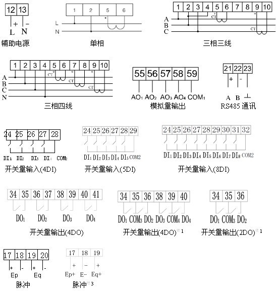 1、ACR300E、ACR310E、ACR320E(L)在選配K(4DI/4DO、8DI/4DO)功能時無脈沖信號輸出端口;