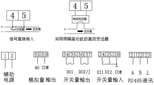 儀表可具有RS-485 通訊接口,采用Modbus-RTU 協議;可帶模擬量輸出、繼電器報警輸出、開關量輸入/輸出。根據不同要求,通過儀表面板按鍵,對變比、報警、通訊、開關量輸出進行設置與控制。