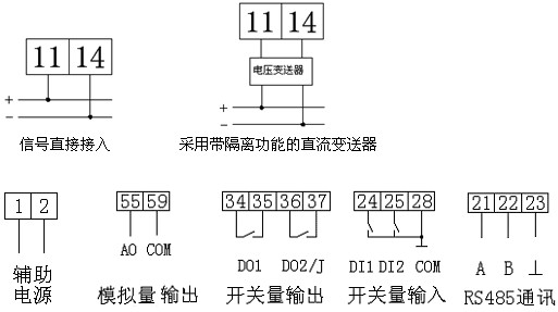 注:J(繼電器越限報警輸出)與第二路開關量輸出復用。