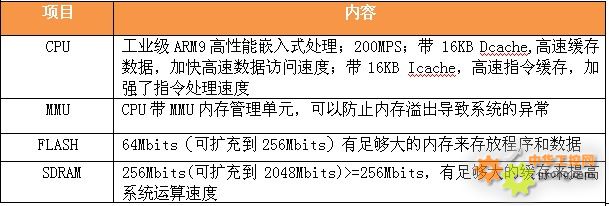 1. 工業級CPU:工業級ARM9高性能嵌入式處理,200MPS;帶 16KB Dcache,高速緩存數據,加快高速數據訪問速度;帶16KB Icache,高速指令緩存,加強了指令處理速度。