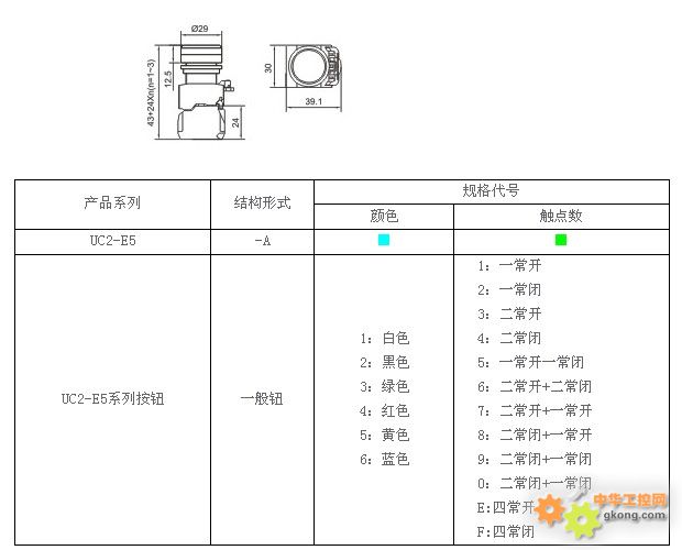1.第1個“■”填寫顏色。 2.第2個“■”填寫常開常閉的觸頭數(shù)代碼。 3.型號舉例: 產(chǎn)品型號 顏色 觸點數(shù) UC2-E5-A21 黑色 一常開 UC2-E5-A32 綠色 一常閉 UC2-E5-A43 紅色 二常開