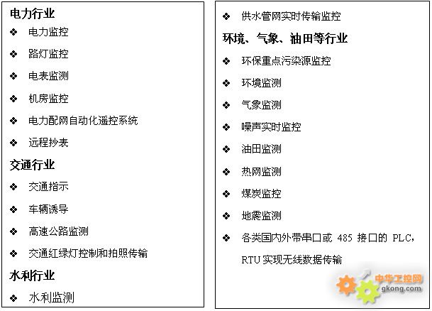 該產品已廣泛應用于水利報警,基站報警,電力集中抄表、水表集中抄表、熱網監控、燃氣監控、水利監控、環保檢測、氣象檢測、地震監測,交通控制等等行業。