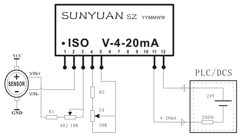 概述: SunYuan SIP12 Pin封裝的二線制電壓信號隔離配電器:ISO V-4-20mA,是二線制電壓信號隔離配電模塊,可實現兩線制電壓輸入配電型傳感器和電橋(稱重)檢測電路的電壓信號配送。 產品設計為低成本、小體積的標準SIP12 Pin阻燃IC封裝,內部包含電流信號調制電路,電磁隔離變換電路及信號還原解調電路。供電電壓范圍12-32VDC,輸入等效電阻小、線性度高,信號輸入與輸出之間可達到2500VAC隔離耐壓。產品使用十分方便,客戶只需在產品前端加上少量外圍器件,即可實現兩線制電壓輸入配電型傳感器和電橋(稱重)檢測電路的電壓信號隔離輸出功能,用戶設計時可參考典型應用電路圖。 SMD工藝結構及新技術隔離措施使該器件能達到:信號輸入與輸出3KVDC隔離(全隔離型),并且能滿足工業級寬溫度、潮濕、震動的現場惡劣工作環境要求。 ISO V-4-20mA二線制電壓信號隔離配電器使用非常方便,只需很少外部元件,可實現兩線制電壓輸入配電型傳感器和電橋(稱重)檢測電路的電壓信號配送。 SY系列的輸入、輸出非隔離型產品,具有很高的精度和線性度(優于0.05F.S),常用在內置式電子尺、角位移信號變送器等精密測量儀器儀表中。產品體積小、安裝方便,可安置在傳感器內部直接將位移、角度信號轉換成標準的4-20mA信號,滿度和零點都可由用戶通過外接電位器調節、校準。
