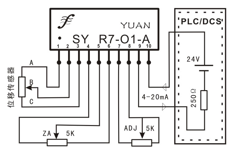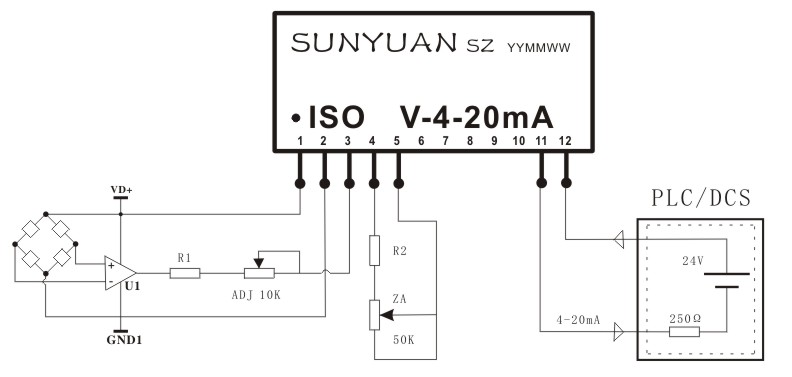 二、非隔離型高精度電壓信號無源配電器 IC:SY R-P-O (Sip10Pin) 應力、電阻信號無源配電放大器SY R-P-O系列產品,可將壓力、稱重、直線或角位移傳感器輸出信號進行高精度放大并轉換成標準的兩線制4-20mA模擬信號,滿度和零點都可由用戶通過外接電位器調節、校準。 1、電阻信號無源配電放大器典型應用圖