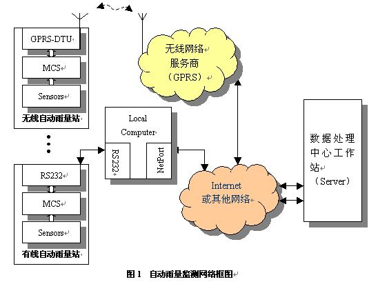 自動氣象站是由電子設備或計算機控制的自動進行氣象觀測和資料收集傳輸的氣象站。從數據傳輸方式上分通常有兩種形式:通過有線網絡發送信息的自動氣象站和通過GPRS無線方式直接發送信息的自動氣象站。將多個自動氣象站數據信息利用有線或無線方式連接至數據中心處理系統就構成了自動氣象監測網絡,通常它采集到的數據是多要素的氣象信息。我們這里所介紹的是雨量監測網絡采集的是單要素雨量信息,通過擴展自動站的傳感器系統即可實現多要素信息采集。
