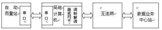 自動雨量采集設備有多個,它們用各自的GPRS數據終端將數據打成IP包,經GPRS空中接口接入無線GPRS網絡,由移動服務商轉接到Internet,最終通過各種網關和路由到達統一的數據處理中心工作站。需要指出的是GPRS終端向數據業務中心發送數據是間斷性發送,可以根據需要調整發送數據的頻率,這在一定程度上也降低了無線信息傳輸費用。在整個無線網絡設計過程中首先要解決的關鍵問題是:如何進行氣象信息采集單元與GPRS終端的連接,如何根據具體無線網絡情況合理設置,如何進行數據打包發送并在數據中心工作站實現接收。