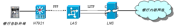 在上圖4中,銀行ATM自助終端通過目前的GPRS&CDMA無線網絡接入終端,實現(xiàn)網絡連接,移動/聯(lián)通等運營商提供了接入服務器LAC,通過無線終端設備向運營商接入服務器LAC發(fā)起PPP撥號,實現(xiàn)與銀行中心接入服務器LNS之間的L2TP隧道的建立,并將無線終端的PPP撥號轉向銀行接入服務器LNS,最終實現(xiàn)無線終端與LNS之間的PPP會話的建立,在銀行網絡核心,部署一臺安全VPN服務器,接受來自無線網絡接入終端的IPSec會話請求,通過與ATM自助終端無線VPN終端之間建議IPSec隧道,實現(xiàn)相互之間數(shù)據(jù)傳輸?shù)陌踩用堋?O:P>