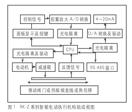 針對上述問題,上海銳凱儀表有限公司花大力氣開發了新一代RK-Z系列智能電動執行機構,較好解決了這些缺陷和不足。RK-Z系列智能電動執行機構系統構成見圖1所示。它采用全封閉、一體化結構,配以單相永磁式交流同步電動機,體積小、重量輕、結構簡單、傳動慣量小、轉矩大等特點。限位和剎車采用逐步逼近電子技術,實現了閥門“柔性全開”和“柔性全關”,取消了限位開關和剎車片,解決了長期以來困擾的限位開關易失靈、剎車片易“抱死”以及剎車時易產生大沖擊電流燒壞電動機等老大難問題。為提高整機可靠性,采用了可靠性設計、可靠性試驗、失效分析和嚴格的篩選、老化等工藝措施,并最大限度地減少了可動部件,使整機MTBF值達到40000萬小時以上。