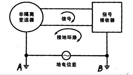 在工業生產過程中實現監視和控制需要用到各種自動化儀表、控制系統和執行機構,它們之間的信號傳輸既有微弱到毫伏級、毫安級的小信號;有有幾十伏,甚至數千伏、數百安培的大信號;既有低頻直流信號,也有高頻脈沖信號等等,構成系統后往往發現在儀表和設備之間傳輸相互干擾,造成系統不穩定甚至誤操作.出現這種情況除了每個儀表、設備本身的性能原因如抗電磁干擾影響外,還有一個十分重要的原因就是各種儀器設備根據要求和目的都需要接地,例如為了安全,機殼需要接大地;為了使電路正常工作,系統要有公共參考點;為了抑制干擾加屏蔽罩,屏蔽罩也需要接地.但是由于儀表和設備之間的參考點之間存在電勢差(也就是各設備的共地點不同)因而形成“地環流”、“接地環路”問題是在系統信號處理過程中必須要解決的問題.如圖1所示,A為被測信號的接地點,B為測試系統的接地點.這樣就形成由A地經信號線到測試系統,在通入B地,并由此地進入大地回到A點,就形成地環流.地環流地測試信號形成干擾,當環流很大時,至使A,B兩點出現很高的共摸噪聲電壓,并通過分布參數耦合到信號線,或直接連接到電平信號線上,將產生很大的串模干擾,甚至損壞接口電路及設備.因此,不可掉以輕心,必須嚴加防范!