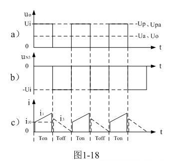 圖1-17中,在Ton期間,控制開關(guān)K接通,輸入電源Ui對(duì)變壓器初級(jí)線圈N1繞組加電,初級(jí)線圈N1繞組有電流i1流過,在N1兩端產(chǎn)生自感電動(dòng)勢(shì)的同時(shí),在變壓器次級(jí)線圈N2繞組的兩端也同時(shí)產(chǎn)生感應(yīng)電動(dòng)勢(shì),并向負(fù)載提供輸出電壓。開關(guān)變壓器次級(jí)線圈輸出電壓大小由(1-63)、(1-69)、(1-76)、(1-77)等式給出,電壓輸出波形如圖1-18-a)。