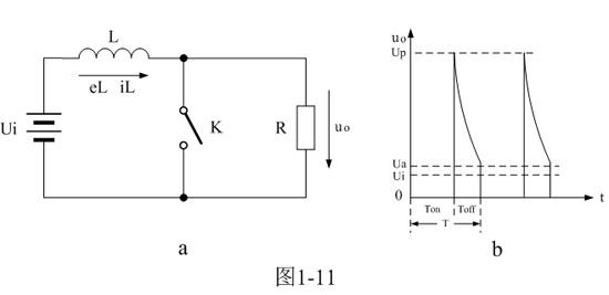 式中Ton為控制開關(guān)K接通的時間。當(dāng)圖1-11-a中的控制開關(guān)K由接通狀態(tài)突然轉(zhuǎn)為關(guān)斷時,儲能電感L會把其存儲的能量(磁能)通過反電動勢進(jìn)行釋放,儲能電感L產(chǎn)生的反電動勢為: