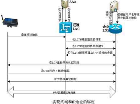 根據(jù)L2TP信令流程,在終端通過認(rèn)證后將進(jìn)行IPCP的協(xié)商。我們控制了IPCP協(xié)商階段,使其能針對(duì)終端分配不同固定IP地址,其原理圖如下: