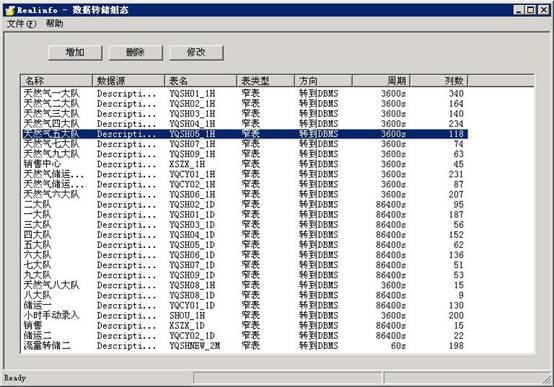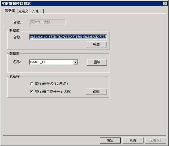 在這個(gè)界面中,用戶可以完成增加、刪除和修改數(shù)據(jù)表等操作。數(shù)據(jù)轉(zhuǎn)儲(chǔ)組件將轉(zhuǎn)儲(chǔ)的單位定義為數(shù)據(jù)表,用戶可以定義數(shù)據(jù)表中轉(zhuǎn)儲(chǔ)的數(shù)據(jù)、轉(zhuǎn)儲(chǔ)的時(shí)間和時(shí)間間隔等相關(guān)信息。