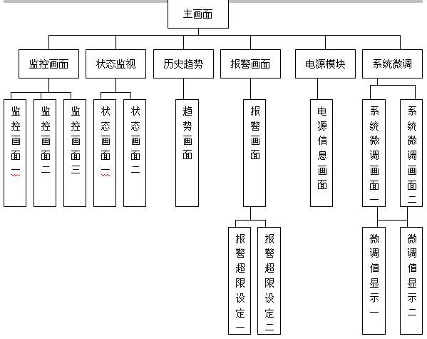 圖1 硬件體系設計 鐵路信號電源監控硬件體系設計參見圖1。系統規模:44個數字量輸入;1個數字量輸出;6個電源模塊;39路模擬量輸入。 控制系統配置如下:觸摸屏:DOPA75CSTD;PLC:DVP16EH00T+1個DVP04AD-H+3個DVP16HM11N;電源模塊通訊卡1塊;分時采集電路卡1塊。 觸摸屏主要是用來顯示采集數據、報警、報警上下限設定、采集數據顯示微調、報警數據顯示、歷史趨勢圖顯示等。PLC主要是采集數據并計算,由于考慮系統對模擬量采集的速度要求不是很高,為了節省成本,系統中使用了1 個DVP04AD-H對39路模擬量進行了分時采集,為了實現這個功能我們與廠家共同實驗開發了一個電子開關電路,對39路模擬量分了十組、每組4路,通過輸出不同的組別進行采集。電源通訊卡主要負責把6塊電源模塊的數據匯總并且通過RS484接口以MODBUS協議與PLC通訊,使PLC采集得到6塊電源模塊的數據,為實現這個功能我們公司的電源研發部門做了大量的工作,最終使PLC與電源模塊的通訊卡實現了通訊,電源模塊的信息得到了采集。 2.2軟件體系設計 (1)系統功能設計:44個數字量采集顯示,故障判斷;6個電源模塊的數據采集顯示、顯示電源模塊的工作狀態并判斷報警;39路模擬量顯示、并判斷上下限報警;顯示報警畫面、報警信息、當前報警、報警頻次;報警上下限設定;數據微調功能,并且顯示微調值;歷史趨勢圖顯示;不同畫面開啟權限設定; 以上有必要說明的是數據微調功能,由于現場的一次測量元件測量會有誤差,而且此誤差是固定的,短時間內是不變的,所以在程序當中增加這部分功能,使最終顯示出來的數值是消除誤差之后的值; (2)系統結構設計分為HMI人機對話界面部分和PLC現場監控部分。HMI部分主要構架參見圖2。