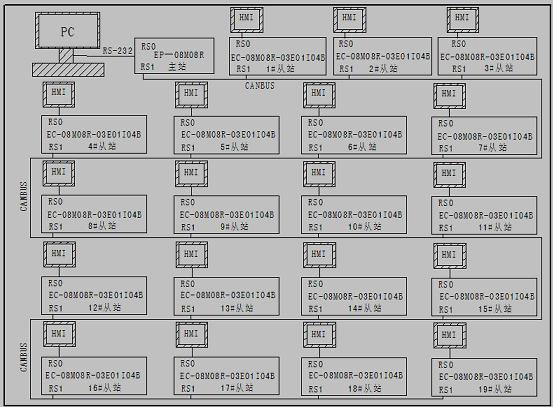 該鋰電池生產(chǎn)廠(chǎng)家一共有除濕機(jī)30臺(tái),有房間50間。每一臺(tái)除濕機(jī)需要一臺(tái)除濕機(jī)PLC,該系統(tǒng)一共用科威PLC 51臺(tái),51臺(tái)PLC分布在樓上樓下二層,51臺(tái)PLC組成一個(gè)CANBUS網(wǎng)絡(luò),CAN主站將數(shù)據(jù)送到中控室計(jì)算機(jī)中。現(xiàn)場(chǎng)用觸摸屏控制,中控室用計(jì)算機(jī)控制并記錄相關(guān)信息。