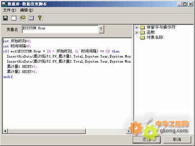 既然這里我們是8小時統計一次,我們就可以將系統小時變量($SYSTEM.Hour)的變化作為事務處理的觸發條件(實際應用時,我們可以統計周期選擇其它觸發條件)。每當系統小時值發生變化時,首先檢查是否到了8小時的時間間隔,如果到了就將“累計量1”和“累計量2”的當前值累計值(參數TOTAL)通過歷史插值的方法保存到“累計統計1”和“累計統計2”過程值中(參數PV),然后再將“累計量1”和“累計量2”的當前值累計值復位(清零)。通過這樣處理我們得到了一個每8小時統計一次的階段累計量值。