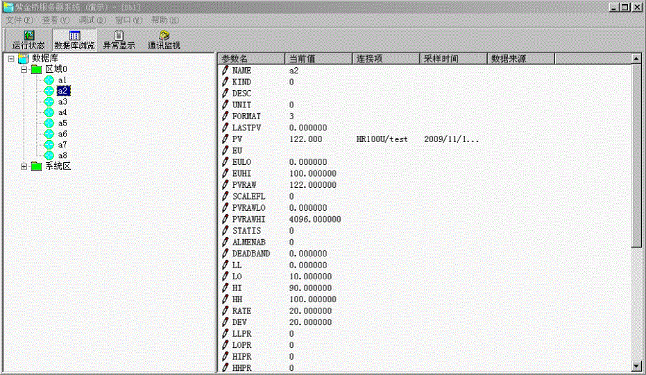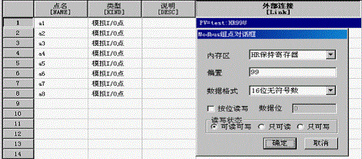建立數據庫模擬I/O點,a1-a8,然后關聯外部連接,點名建立后雙擊后邊外部連接的空白處,彈出modbus組點對話框,選擇保持寄存器也就是modbus的功能碼03,偏置地址選擇99,對應的modbus協議的地址是100(紫金橋軟件的偏置地址加1對應的是modbus協議地址)如圖6所示;