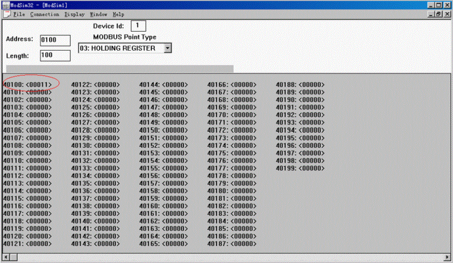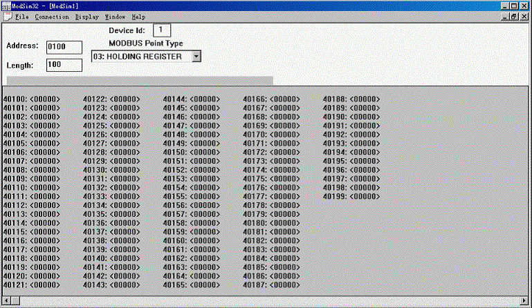 點擊“file”,然后點擊“new”新建一個窗口,Device Id:1對應的是組態軟件里的設備地址1,03:HOLDING REGISTER對應的是保持寄存器。ADDRESS:0100是從地址100開始。如下圖所示;