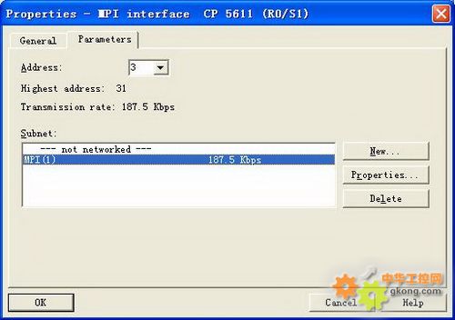 3、 選擇新建的PC Station,雙擊Configuration打開組態對話框,在右面Catalog中選中SIMATIC PC Station\CP PROFIBUS\CP5611\SW6.0(任意版本),然后拖拉到左面PC機架的1號槽,在彈出的PROFIBUS接口屬性對話框中直接點擊OK按鈕即可(不要去新建PROFIBUS網絡,因為我們需要設置CP5611為MPI方式)。雙擊CP5611,在彈出的屬性對話框中設置CP5611的接口協議為MPI,點擊Properties按鈕,在彈出的MPI接口屬性中選擇MPI(1)。由于MPI網絡上地址不可以相同,因此STEP7軟件會自動給CP5611提供一個MPI地址(如3)。