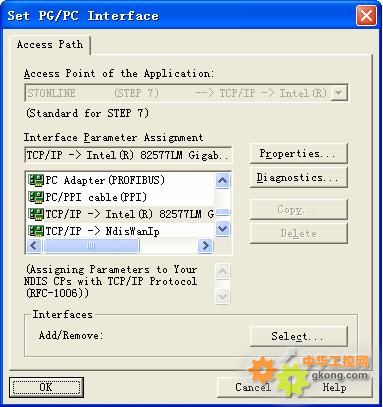 打開STEP7編程軟件,選擇菜單”Options\Set PG/PC Interface…”,在彈出對話框中選擇TCP/IP->(計算機網卡),按”確定”退出。