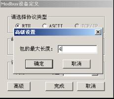 下一步,進行Modbus設備定義,將高級設置中的包的最大長度改為4: