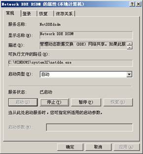 打開“控制面板”—“管理工具”下的“服務”一項,或者直接在運行中輸入“services.msc /s”打開“服務”設置。找到Network DDE DSDM,雙擊打開屬性對話框,在“常規”選項中將啟動類型改為“自動”,并啟動該服務,如下圖,Network DDE也要進行同樣的修改。