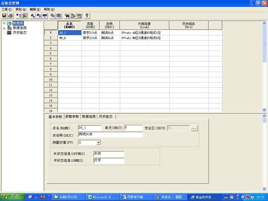 其次雙擊“數據庫”導航樹里的“點組態”圖標進入點組態畫面,建立兩個數字I/O點M6_6和DO_1,M6_6與PLC中點M6.6連接, DO_1與PLC中點QO.1連接。如圖6所示