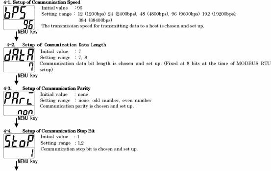 還要對SHIMAX MAC3系列儀表的通訊參數進行設定,按住儀表的MENU鍵3s,會彈出 ,通過向上鍵選到 ,通過MENU一次進行如下參數設置。