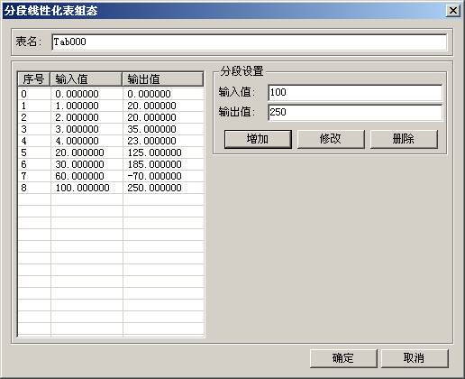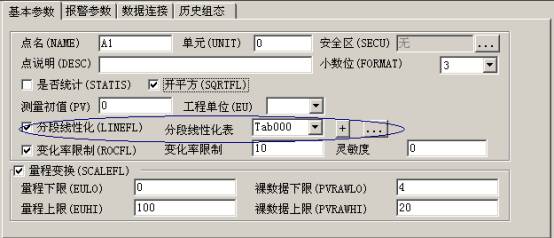 表名是分段線性化的索引,在整個數(shù)據(jù)庫系統(tǒng)中唯一,由字母和數(shù)字組成,最多不超過64個字符。 前面說過,分段線性化表是把輸入分成若干段,每一個分隔點都有一個輸入和輸出與之對應。因此,在組態(tài)時,要設計其分隔點的輸入和輸出,在分段設置框中分別輸入合適的輸入值和輸出值,點擊增加,則在分段線性化表中就增加一個分隔點。因為分段線性化對于一個輸入只能有一個輸出,如果增加時相同的輸入已經存在,則增加無效。 修改時如果當前選中了一個分隔點,則修改時只修改當前選中分隔點的輸出值。 刪除時刪除當前表的選中的分隔點。 對于一個分段線性化表而言,最少需要有兩個分隔點。 建立一個分段線性化表之后,就可以在模擬IO點中引用了,在點表中選擇一個模擬IO點,在其基本參數(shù)頁中進行分段線性化組態(tài):  注意,如果要進行分段線性化,必須首先讓該點分段線性化使能。在分段線性化表中選擇已經組態(tài)好的分段線性化表,如果沒有組態(tài),則點擊按鈕 新增加一個分段線性化表,也可以通過點擊按鈕 對已經建立的分段線性化表進行修改。 這樣,在系統(tǒng)運行時,DB將自動對輸入變量進行分段線性化。