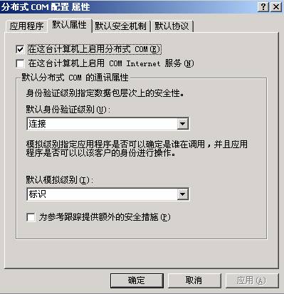 選擇開始-〉運(yùn)行,輸入“dcomcnfg”,并選擇“確定”。這時會彈出“分布式COM配置屬性”對話框。選擇“默認(rèn)屬性”標(biāo)簽頁,將“在這臺計(jì)算機(jī)上啟用分布式COM”選擇上。
