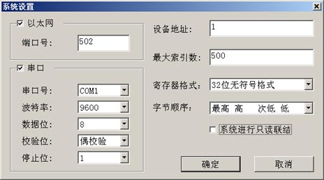 我們可以看到共有以太網和串口兩種方式供選擇使用,你可以選擇他們中的一個或兩個。當選中以太網方式之后,必須輸入相應的端口號,缺省情況下是502端口,這是Modbus以太網協議規定的缺省端口號。當選中了串口方式后您需要選擇對應的串口并作和采集方相同的配置。