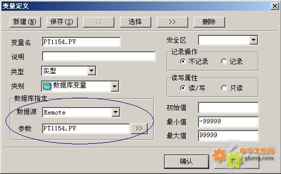 提示:如果有兩個(gè)數(shù)據(jù)庫的變量同名,如上例中在本地?cái)?shù)據(jù)庫中已經(jīng)存在一個(gè)變量PT1154.PV,而且需要同時(shí)訪問這兩個(gè)變量,則在定義變量時(shí),把其中的任何一個(gè)定義為其它名稱,如把Remote的PT1154.PV定義為RPT1154.PV即可。